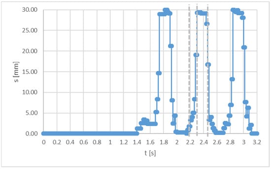 Waste valve time displacement (dotted blue line) from optic laboratory measurements (s is the piston stroke, t is time)—Average values are then extracted (in between dashed grey lines): progressive closing time: 0.080 s; complete closing time: 0.140 s.