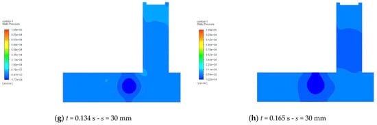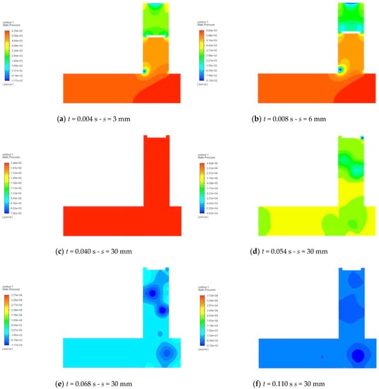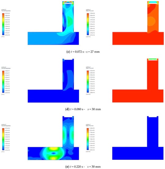 Velocity results for scenario n. 1 are reported in Figure 7 in comparison with a series of frames extrapolated from the simulation, with the trend of the pressures inside the waste valve. Results are given at progressive times t of the simulation, for which the position of the piston is also given (s = 0 corresponds to the half length of the valve and, therefore, smax = 30 mm).