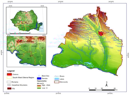 Localization of Craiova in the local, regional, and national context. Source: authors’ processing using ArcGIS 10.7.1.