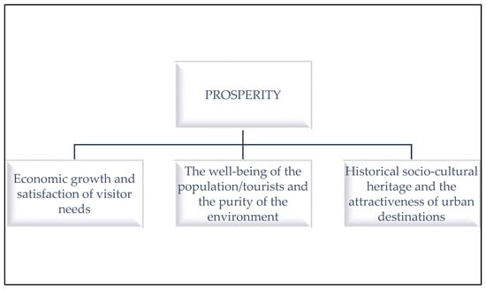 Prosperity represents one of the main economic indicators [47] fundamental in achieving the development of sustainable and innovative tourism for medium-large urban destinations in Romania. Thus, for prosperity in the context of an urban tourist destination, it is predictably necessary to attract safety, prosperous conditions regarding the comfort of residents and also of tourists, unique experiences that are at the same time of a clearly superior quality to each tourist [48], spectacular landscapes from an aesthetic and visual point of view, the valorization of the ecosystem environment (terrestrial and aquatic) of the destination, and an increased standard of effectiveness through the appropriate evaluation and planning of strategies, policies, tourism development, and management plans for each tourist destination.