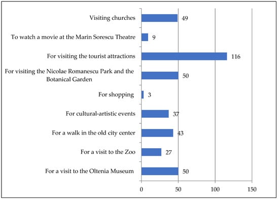 The relevant data from the responses regarding preferences for spending a weekend in Craiova compared to other cities show a variety of reasons and tourist attractions that can attract visitors to the city (Figure 3). A significant number of respondents mentioned that they would like to spend a weekend in Craiova to visit tourist attractions (116) and museums, such as the Oltenia Museum (50). This indicates that the cultural heritage and tourist attractions in Craiova are highly attractive to visitors, and they are interested in exploring the city’s history and culture. Additionally, some respondents mentioned that they would like to spend a weekend in Craiova to visit the Nicolae Romanescu Park and the Botanical Garden (50), take a walk in the old city centre (43), or visit churches (49). These reasons indicate the appeal of the city’s natural landscape, architecture, and spirituality to tourists. Other reasons mentioned in the responses include cultural and artistic events (37), as well as watching a show at the Marin Sorescu Theatre (9). Some respondents also mentioned that they would like to go shopping in Craiova (3).