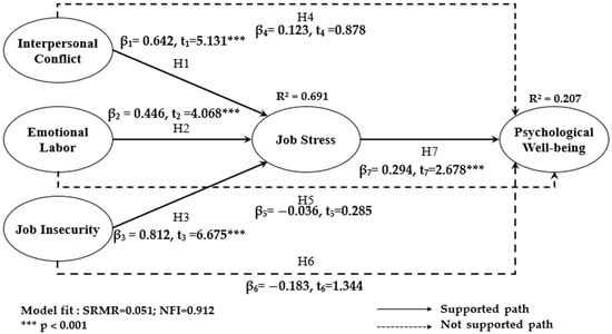 | Interpersonal conflict => Job stress => Psychological well-being | 0.196 | 2.431 * | 0.049 | 0.354 |