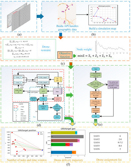 TD3PSO-based realization scheme of uncrewed aerial vehicle (UAV) emergency material distribution in mountainous areas. (a): The data collection part of the paper; (b): Data processing section, which processes the collected data and creates 2D maps; (c): This part is the objective function, which consists of a mathematical model and power priority nodes; (d): The td3pso algorithm solution framework; (e): The task reassignment framework, and the task solution process e-process is not necessary; (f): The output of the algorithm (UAV direction trajectory, Gantt chart, table of task assignment results).