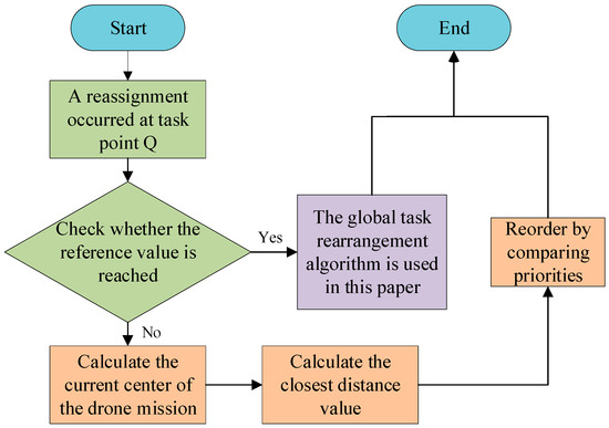 The failure of drone task assignment can occur in various unforeseen circumstances; the failure situation considered in this paper is the new task point or drone damage. Depending on the effects of the failure situation, the drone task reallocation into global redistribution and local adjustment. The amount of task transformation threshold setting is 10 percent of the original task as Equation (16):