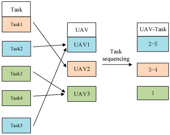 N stands for the number of tasks, H for the number of drones, and the number of tasks is the particle dimension. Limit the size of the particle’s position to [0, N] and the update velocity to [−1, 1] using real number encoding. Let the particle’s position and velocity be N-dimensional real vectors. Then, in the decoding process, let Int(n) be the integer part of the actual number n, and P(N) denotes the fractional part of n, e.g., Int (3.56) = 3, p (3.65) = 0.56 where Int(n) = k indicates that the nth task is assigned to drone k. The size of the fractional part and the power node importance weight in the decoding process together determine the drone distribution task order, from which the task sequence can be solved. This paper stipulate that the drone material transport is strictly assigned according to the weight parameters. In Figure 2 or in Table 2, the mission priority is displayed as weight sorting (a > b > c > d > e), and the mission decoding value is displayed as n, presuming there are three UAVs and five mission target points. Figure 3 shows the decoding procedure and outcomes.