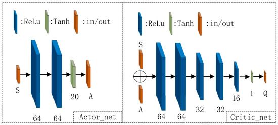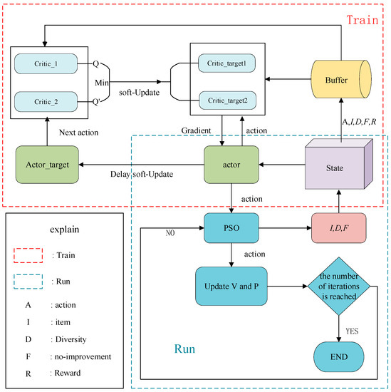 Figure 4 below shows the algorithm flowchart made for this study by the TD3 algorithm update process and PSO algorithm update method mentioned before. The training flowchart is shown in the red dotted box; the specific process and the above TD3 algorithm process are similar. The specific flow of the TD3PSO algorithm is explained as shown in Algorithm 3. The TD3PSO algorithm running flow sketch is in the blue dotted box, as seen in the image. The state, action, and reward [13] settings for the particle swarm algorithm employed in this study are displayed below: