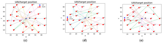 This study simulates the above algorithm results at t = 2.2 moments, where Drone 2 is damaged and unable to proceed with the following task allocation scheme. At this point, the task is changed to a heterogeneous drone allocation task, and the current drone’s location serves as the drone’s new starting point for the task allocation calculations, as the Table 15. The current coordinate information is also provided.