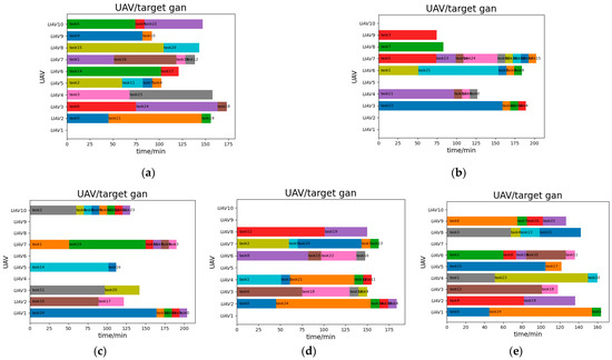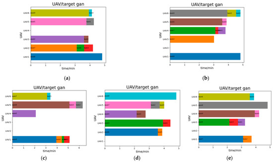 Real experiment task allocation Gantt chart. (a): PSO task solving; (b): PSO- task solving; (c): MGRR-PSO task solving; (d): RLPSO task solving; (e): TD3PSO task solving.