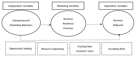 Scholarly journals have widely discussed models of entrepreneurial marketing versus resilience theory for small businesses. Most of the emphasis touches on the importance of EM for small business resilience, such as the factor analysis of SME resilience amid COVID-19 [72]; effectual causal logic for small firms’ resilience, such as organizational learning, firm resources, and organization plan-oriented strategy during the pandemic [73,74,75,76,77]; and the design framework for dynamic organizational strength [78,79]. All of these offered groundbreaking novelties in navigating the practical application for MSME’s sustainable market and firm’s innovation, technology adoption, and stakeholder relations strategies, to name the least. Nevertheless, the idea of testing the EM behavior components with factors of business resilience for a smooth and sustainable business rebound has not yet been fully explored. Due to Morris and Jones [7], the basic framework for the application of MSME’s EM behavior has been rigorously provided (see Figure 1).