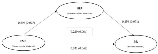 The next requirement is ensuring that BRP (the mediator) significantly influences BR. We can argue that BRP has a significant effect on BR, as shown in Table 5. Thus, we can proceed to examine whether business resilience practice (BRP) can mediate the relationship between entrepreneurial marketing behaviors (EMB) and business rebound (BR).