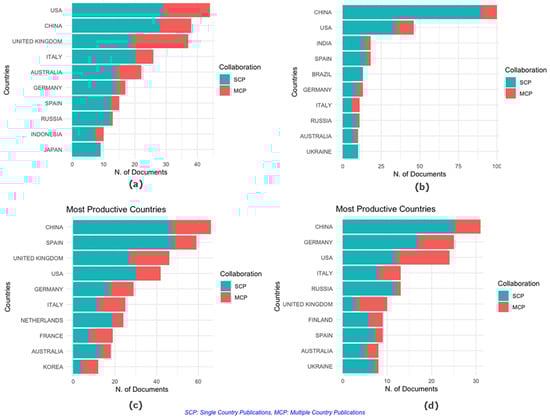 Bibliometric analysis of countries with the most publications on (a) Corporate Governance, (b) Technology Management, (c) Innovation Management, and (d) Digital Transformation.