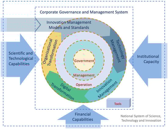 The proposed model developed under the corporate approach of innovation processes and systems, can integrate and complement the processes of Technology Management, Innovation Management, Digital Transformation, and Organisational Transformation around the patterns of governance, management, and operation at the core of the organisations, whose moderating input is given by the models and standards of Innovation Management and the organisational scientific and technological capabilities, the financial capabilities and the corporate capacity of the environment, these inputs are given by the elements of the innovation system of the scenario, in which the organisations interact.