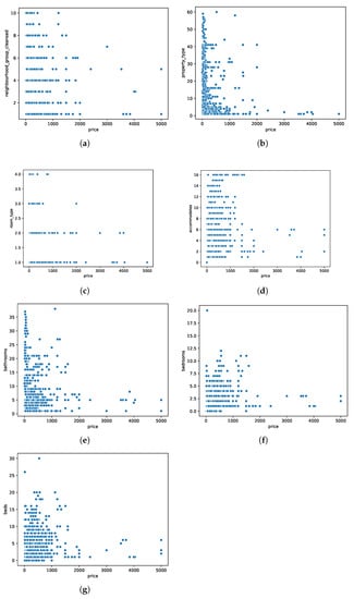 The visual analysis of Feature Set 1. (a) The relationship between Price and Neighbourhood_group features; (b) The relationship between Price and Property_type features; (c) The relationship between Price and Room_type features; (d) The relationship between Price and Accommodates features; (e) The relationship between Price and Bathrooms features; (f) The relationship between Price and Bedrooms features; (g) The relationship between Price and Beds features.