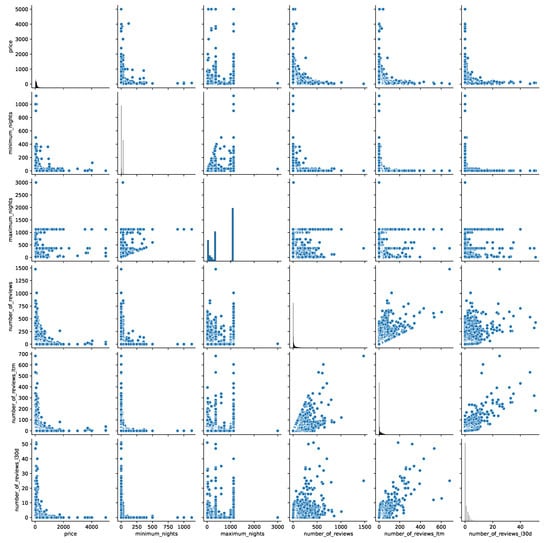 Figure 5 shows the visual analysis of Feature Set 2. This figure provided information regarding the correlation between price and the variables minimum_nights, maximum_nights, number_of_reviews, number_of_reviews_ltm and number_of_reviews_l30d, as there were relationships between these factors. The price values were influenced by the values of these variables. For the variable minimum_nights, when the value ranged from 0 to 100, the corresponding price values were at their highest, ranging from 100 to 5000+. As the minimum_nights value increased beyond 100, the price decreased, and when it reached a critical value of around 400, the price became zero. Similarly, for the variable maximum_nights, when the value ranged from 0 to 1000, the corresponding price values were at their highest, ranging from 100 to 5000+. However, when the maximum_nights value exceeds 1000, the price becomes zero.