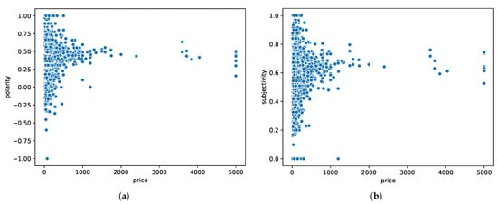 From the scatterplot shown in Figure 6a, we can see that the polarity had values ranging from −1 to 1. Polarity values between 0 and −1 had some effect on price. We can see polarity value effects on price ranging from ≅100 to ≅500. In contrast, we can visually observe that the polarity value −1 had an effect on price at one point that was approximately ≅100, while values ranging from 0 to 1 had the most effect on prices, ranging from ≅100 to 5000+.
