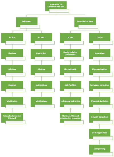 The soil is a great absorber of pollutants, but it is also very sluggish in its ability to eliminate them, which makes it an ideal filter. In light of the environmental and human health risks, as well as economic implications, the decontamination of polluted soils has become a major point of public and political discussion over the last couple of decades. To address this problem, various physical, chemical, and biological processes have been developed to clean up contaminated soils. Figure 2 provides a brief summary of the available technologies for remediation of organic and inorganic pollutants in soils.
