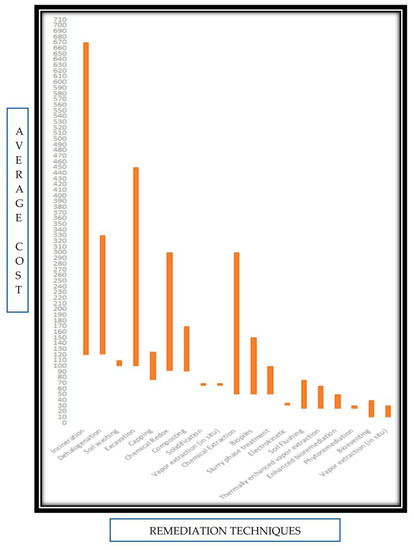 Once the need for soil decontamination has been recognized, the most appropriate technology is chosen based on the classification, the toxicity and the origin of the pollutant, the existing and probable hazard linked to the degree of contamination, the chemical and physical features of the soil, the purpose of the land, the available time for purification, the population’s approval, and a cost/benefit appraisal. The above-mentioned technologies greatly differ in how they address these diverse conditions. For example, the average cost of cleaning with the various technologies can vary significantly (Figure 3). In developed countries, economic advantages are motivating the development of low-cost, low-input technologies, which is also essential to dealing with the treatment of hazardous soils in developing countries [14,15].