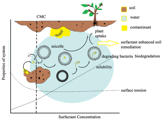 At the point when the surfactant concentration hits its critical micelle concentration (CMC), micelle structures will begin to form. As the surfactant molecules continue to expand, ellipsoidal or round micelles are created. These micelles, with their hydrophobic cores and lyophobic surfaces, are equipped for helping with the desorption of toxins from the soil. They can spread NAPLs (non-aqueous-phase liquids) and greatly boost their solubility in water. Given that the pollutants dissolved in the water are more mobile, they may be then eliminated through biotic or abiotic means, such as plant absorption and microbial decomposition (Figure 5) [20].