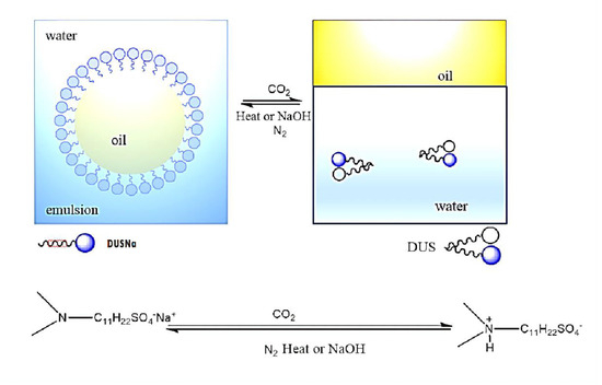 Reversible switch among 11-Dimethylamino undecyl sulfate sodium (DUSNa) and its inactive form (DUS) under the stimuli of carbon dioxide, nitrogen, and/or sodium hydroxide [33].