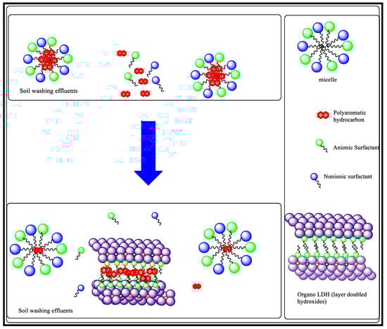 - Zhang, M.; Zhao, C.; Li, J.; Xu, L.; Wei, F.; Hou, D.Y.S. Organo-layered double hydroxides for the removal of polycyclic aromatic hydrocarbons from soil washing effluents containing high concentrations of surfactants. J. Hazard. Mater. 2019, 373, 678–686. [Google Scholar] [CrossRef] [PubMed]
