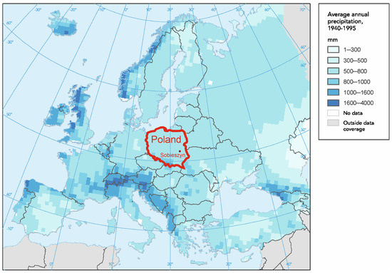 Location of the study facility on the map of average annual precipitation in Europe (map drawn by the authors based on [29]).