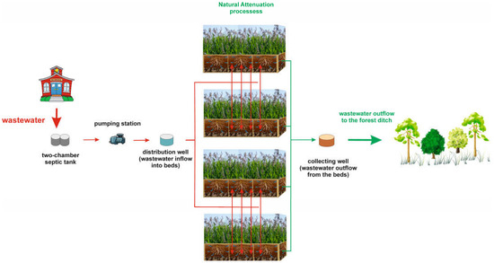 The investigated CW was built in 1995 near the School of Agriculture in Sobieszyn in southeastern Poland (geographic coordinates: 51°35′37″ N 22°09′45″ E). The treatment plant (Figure 2) consists of the following components: a two-chamber preliminary septic tank, a sewage pumping station, and four vertical-flow parallel reed beds with reeds that have a total area of 1287 m2 [30]. The beds are made of several layers of different materials, one layer of fabric and drains. The surface layer, with a thickness of 0.2 m, is made of humus overburden. It is underlain by a layer of loose sand of the same thickness. A 1.2 mm thick filter cloth is lain directly under the sand. Beneath it, lies a 0.3 m layer of dolomite crushed stone that has fragment sizes of 16–32 mm. Below, is a layer of drains collecting sewage. The diameter of each drainage pipe is 100 mm. The lowest layer, with a thickness of 0.1 m, is sand, and a 1 mm thick PEHD geomembrane is lain directly below it (whose task is to isolate the deposit from the natural soil). The receiver of sewage flowing out of the facility is a ditch adjacent to the forest, which discharges it into the ground [31].