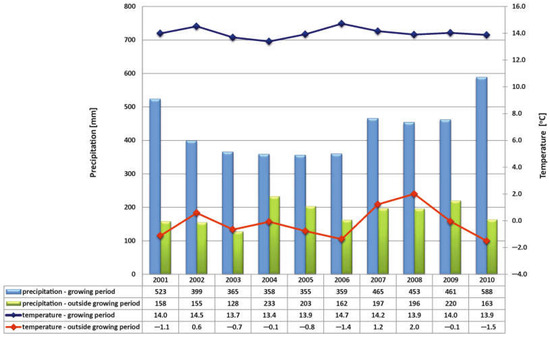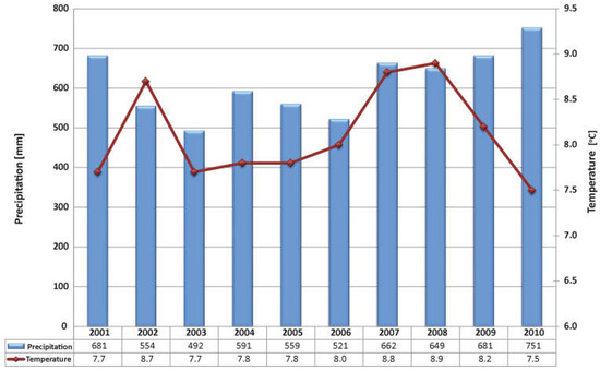 In the period covered by the analysis, both average annual air temperatures and annual precipitation totals were characterized by typical variation. As shown in Figure 3, the highest annual precipitation was recorded in 2011 (751 mm), and the lowest in 2003 (492 mm). In turn, the highest average annual temperature of 8.9 °C was recorded for 2008, and the lowest was 7.5 °C for 2010. The coefficient of variation calculated for the entire study period was 13% for precipitation and 6% for air temperature, which means the variation was low.