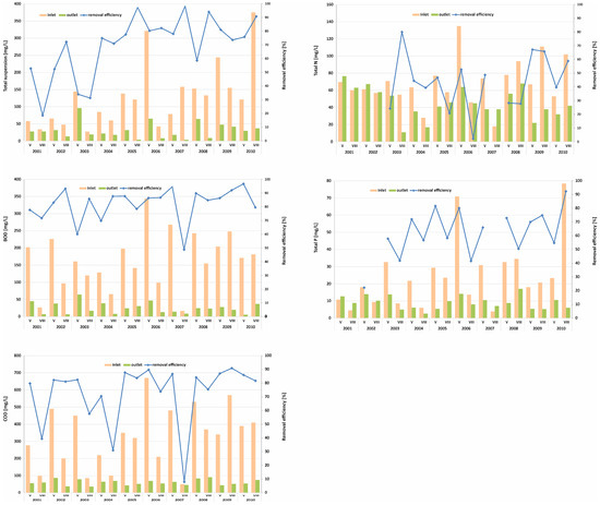 In the growing season, the CW always operated efficiently with regard to the removal of TSS, BOD5, and COD, and a significant reduction in the values of these indicators in the effluent were found compared to the influent (Figure 5). Our analysis showed that the efficiency of the investigated vertical CW beds in reducing the wastewater concentrations of organic pollutants, measured as BOD5, COD, and TSS, was satisfactory. In addition, for the growing period, the mean value was as follows: 82% for BOD5, 73% for COD, and 69% for TSS. As for the nutrients, the concentrations of phosphorus and nitrogen in the effluent were several times larger compared to the inflowing wastewater.