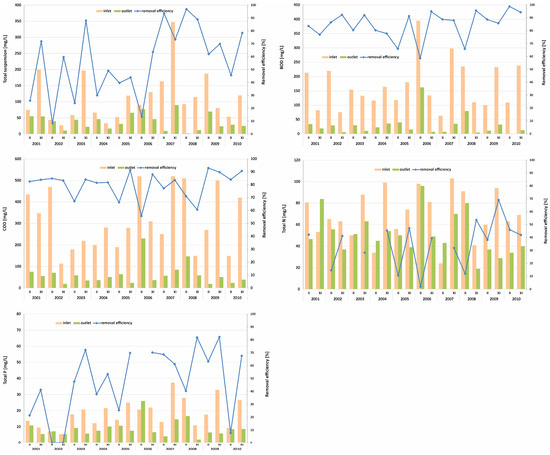 Treated wastewater from the analyzed facility was sampled for testing at regular intervals at four times a year (at the beginning of February, May, August, and November). During the study period, 40 series of analyses were done. Wastewater samples were analyzed for their concentrations of total suspended solids (TSS), BOD5, COD, total nitrogen (TN), and total phosphorous (TP). Four hundred assays were performed using the wastewater samples to determine the composition of raw and treated wastewater. Samples were tested in the Water and Wastewater Testing Laboratory at the Department of Environmental Engineering and Geodesy, University of Life Sciences, Lublin. The wastewater samples were tested following the guidelines provided in “Reference methodologies for the analysis of wastewater samples” and the methodology described in the Polish Standards [32]. The methods we used to determine the values of the analyzed parameters are given below: