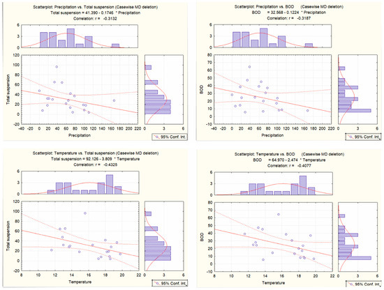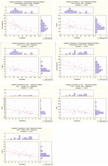 The results of the correlation analysis that were interpreted using the scale proposed by Stanisz [33], showed that the only statistically significant relationship (a high correlation) was that between precipitation and TSS in the non-growing season (a correlation coefficient of 0.59). Moderate correlations were found between the precipitation and TSS and BOD5 in the growing season, and between precipitation and TN and TP in the non-growing season. Similarly, moderate correlations were recorded between air temperature and TSS and BOD5 in the growing season, as well as between air temperature and TSS, BOD5, COD, and TP in the non-growing period. The correlation coefficients for all these relationships were higher than 0.3, which means the relationships were practically significant. The associations observed in the growing season are shown in Figure 7.