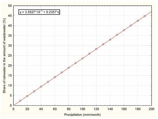 Since the tested facility covers an area of 1287 m2, it was assumed that it may contribute to increasing the amount of inflow and dilution of wastewater flowing out of the treatment plant. Therefore, in this study, the relationship between the amount of monthly sums of atmospheric precipitation and the increase in the amount of wastewater flowing out of the treatment plant was determined.