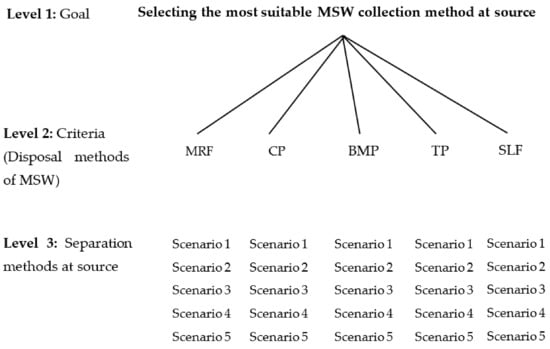 Studies on solid waste management have been developing rapidly in a sustainable and predictable manner over the last twenty years. Mathematical models used in planning sustainable waste management solutions in a predictable structure have an important function in this development process [29]. In the planning and operation of sustainable integrated waste management processes, optimization modeling [30,31,32,33,34], multi-objective approaches [35,36,37,38], multicriteria decision analysis [39,40,41,42], and artificial neural networks [43,44,45,46] are extensively utilized in a user-friendly format that can assist decisionmakers. Integrated waste management is complex, as it requires many processes starting with the generation of the waste and extending to its collection, transfer, and transportation, the treatment of leachate, the biological and the thermal recovery of waste, and the selection of waste disposal sites. Like other mathematical models, multicriteria decision analysis (MCDA) models are also used to provide sustainable and user-friendly solutions for such complex systems. In this study, the analytical hierarchy process (AHP), one of the MCDA models, was utilized for the analysis of the separate collection of solid waste from five different sources according to five waste disposal methods.