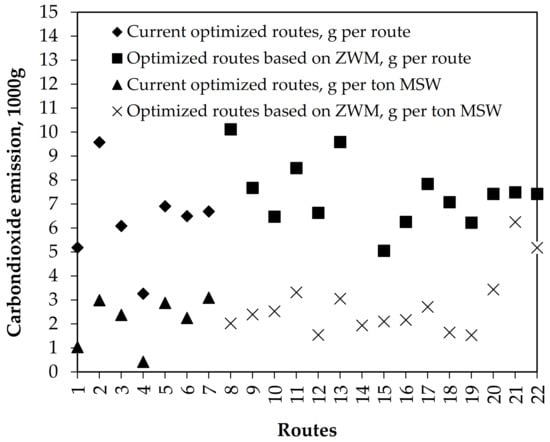 It is known that the type of treatment selected for MSW disposal has both economic and environmental costs. In this regard, the unit cost per ton of treated waste is generally reported both per unit of money, and per ton of carbon dioxide emissions [78,79,80,81]. In a study performed by Medina-Salas [19], it was shown that if organic waste is subjected to composting treatment, while plastic, paper, and glass are recycled and other types are sent to landfills, environmental costs decrease (environmental costs are −0.284 tons of carbon dioxide per ton of MSW; economic costs are USD 49 per ton of the MSW) [19]. In addition, the same costs are also important for MSW collection and transportation processes. Emissions from existing solid waste collection and hauling systems were estimated based on data obtained from observations in situ, records analyzed, and the other GIS database. The engines of trucks used for solid waste collection in the study area are either Euro 2 or newer. In this study, exhaust emissions were estimated for both the optimized present routes and the optimized ZWM-based routes, using the data obtained from a study performed by Barnaud et al. [82] (see Text S9). Carbon dioxide, nitrogen oxides, hydrocarbons, carbon monoxide, and particulate matter emissions were estimated as grams per route traveled (from Equation (S11)) and grams per ton of MSW collected (from Equation (S12).