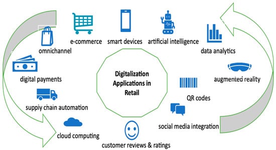 Digitalization, the exploitation of digital opportunities, is among the most significant technological trends responsible for stimulating noticeable changes in societies and businesses [,,]. In retail, digitalization involves integrating digital technologies and strategies to improve operations, drive business growth, and enhance customer services. Industry 4.0 has ushered in artificial intelligence, blockchain technology, e-commerce, big data, cloud computing, etc. [,,,], significantly impacting the functioning of the entire retail ecosystem (see Figure 1). Firms use digital technologies to adapt their business models in response to volatile market environments [,,], to keep up with competitors, and to satisfy customers []. These practices can simultaneously contribute to sustainability in line with CE principles to address environmental challenges []. As Wang et al. [] aptly pointed out, technological innovation in production processes is a major element to consider when implementing CE. Business models such as closed-loop systems, cradle-to-cradle, product-life-extension, remanufacturing, upcycling, the product service system, and extended producer responsibility demonstrate efforts to enhance economic, social, and environmental values. Despite the benefits associated with digitalization, its successful implementation is dependent on investments and other associated costs []. Furthermore, the capacity of digitalization to facilitate service delivery in CE, particularly in the Global South, where most of humanity resides, deserves adequate research attention.