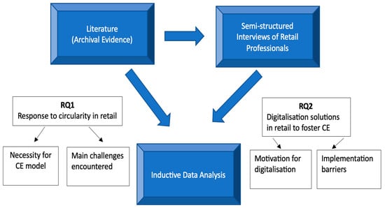 The fundamental aim of this article is to identify the various ways in which digitalization is utilized in retail to facilitate service delivery within a circular economy framework. To this end, a qualitative approach that combined case studies with semi-structured interviews was adopted (see Figure 2). Employing multiple sources of data provides various perspectives and more information, which enables cross-checking and triangulation []. Case studies have been shown to provide accurate and sufficient data to understand complex business situations [,]. They create a rational chain of evidence from actual occurrences [] for critical, in-depth analysis. Four major grocery retailers were carefully chosen as cases for analysis of their circular economy-led activities. These retailers were purposively selected for their scale of operations, locations, richness of available information, and a stated commitment to sustainability. Although the bulk of retail activities in Nigeria take place informally and by SMEs, we chose to focus on major retailers in this paper because they lead innovation and can influence consumers, manufacturers, and suppliers. Supermarkets were chosen primarily because food and daily necessities account for the bulk of household expenditure in Nigeria [].