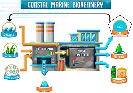 Reducing the resource input and increasing the co-product potential of the production process are critical aspects for spurring the development of seaweed biorefineries. Thus, coastal-based integrated marine biorefinery (CIMB) systems were suggested for the efficient production of third-generation biofuels [11,12]. These systems utilise marine resources (seawater, marine yeast, and marine algae) to produce biofuels and high-value chemicals (HVC) through integrated biological conversion technologies (i.e., fermentation and anaerobic digestion). The integration of these marine resources and conversion technologies could significantly enhance production efficiency and totally eliminate the use of freshwater and arable land in the biofuel industry. This could also enhance the CO2 sequestration potential of the process, making biofuels a more sustainable and eco-friendly energy source [13]. CIMB systems have not yet been thoroughly researched and, therefore, they need intensive investigation. Therefore, the present study aims firstly to discuss the concept of coastal marine biorefineries and their merits over conventional biorefinery systems. The second part of the study aims to analyse the potential of seaweeds for CO2 sequestration by calculating the time required to remove 100 GT of atmospheric CO2 through seaweed farming. In addition, the study determines the total bioethanol and HVC that may be produced from the produced seaweed biomass.