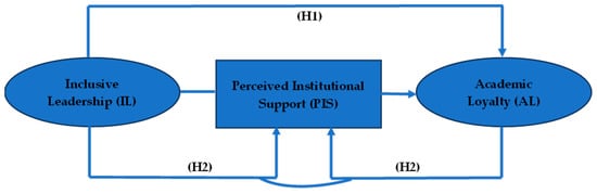 This present study aligns with the relevant literature on a causal relationship between inclusive leadership and academic loyalty and argues within the HEI context that PIS will help identify the underlying mechanism and better explain the relationship between them [77]. This research will make contributions to the literature in four aspects. Firstly, although knowledge in the literature indicates that inclusive leadership depicts a positive relationship with job satisfaction and commitment, work engagement, innovative behaviors, and well-being [78,79,80,81], there is yet no research to have investigated the extent to which inclusive leadership in an HEI setting influences the loyalty of academics. Secondly, this study advances knowledge on the scope of inclusive leadership in an HEI context, which has been indicated to not be well studied [75,82]. Thirdly, with inclusion research still regarded as developing, it may be deemed to be at the infant stage [83], with limited empirical research on inclusive leadership [84]. This study contributes to and advances knowledge on the effects of inclusive leadership and academic loyalty. Fourthly, the paper makes contributions and advances the work on Perceived Institutional Support (PIS) in a HEI setting. To that end, this investigation places the following two hypotheses: