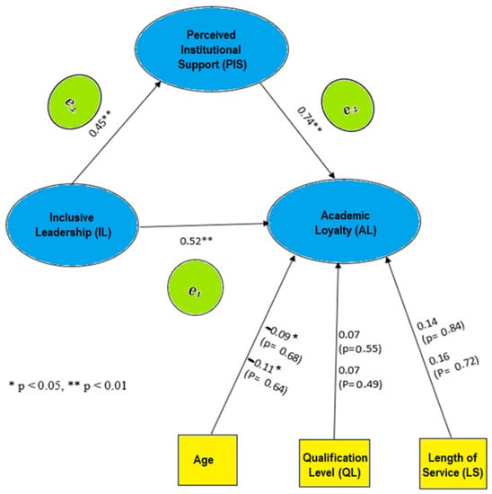 Previous research that bore on this subject (such as James et al. [118]) examined the hypothesized mediating connection using several comparisons for the nested model. This is because mediating models using SEM allows for the analysis of complex models, control for measurement error, specification of relevant paths, and avoidance of under/overestimation of moderation effects ([119]). The first thing that was done was testing the hypothesized mediating model, in which the role of perceived in-institutional support (PIS) was specified as a mediator for the association between academic loyalty (AL) and inclusive leadership (IL). This model also includes the control factors for academic loyalty: length of service (LS), qualification level (QL), and age. In this investigation, these three variables were defined. The findings, which are presented in Table 4, suggest that the model provides a satisfactory match to the data: CMIN/df = 2.768; GFI = 0.891; CFI = 0.919; NFI = 0.908; TLI = 0.923; RMSEA = 0.081.