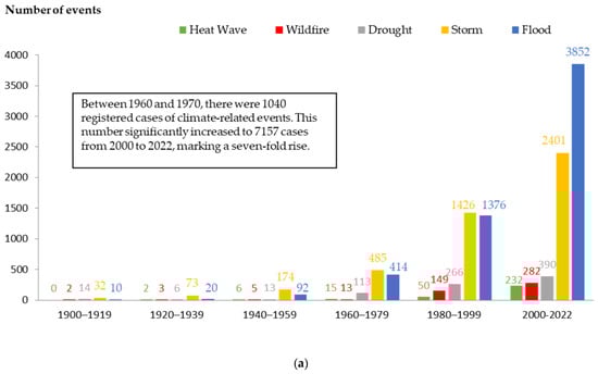 | Floods | Warmer temperatures can increase the amount of moisture in the atmosphere, leading to rainfall events which are more intense, and to an increased risk of flooding. Also, melting glaciers and ice caps contribute to rising sea levels, exacerbating coastal flooding [46,54,55]. |