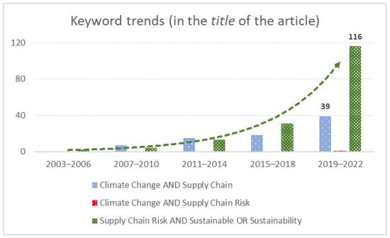 | Keywords | “climate change and supply chain risk management”, “climate change and supply chain operations”, “climate change and sustainable SCs”, “climate change and supply chain risk”, “climate change and supply chain resiliency”, “climate change and supply chain disruptions”, “climate change and business”, “disasters and supply chain risk”, “climate change and supply chain solutions”, “climate change and supply chain analytics”, “climate change and supply chain and sustainable development goals”, “climate change and supply chain losses”, “climate change and supply chain vulnerability” |