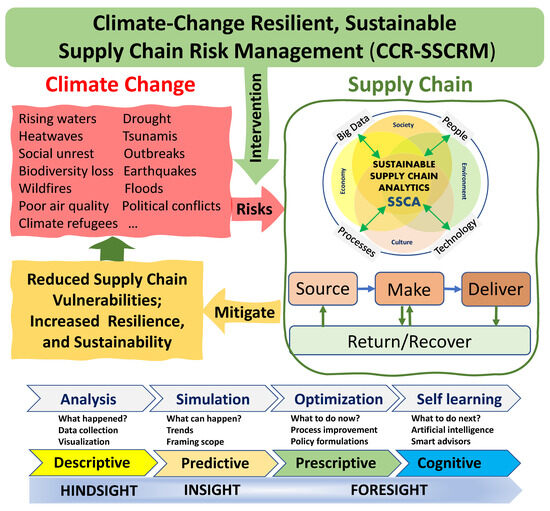 - Exploring the role of intelligent technology and innovation in CCR-SSCM: Technologies like big data analytics and blockchain, and smart process improvement can be crucial in building climate-resilient SCs [27,82,93,134]. These technologies can provide real-time monitoring, predictive analytics, traceability, and transparency, enhancing the ability of SCs to anticipate, respond to, and recover from climate-related disruptions. For example, big data analytics can process large volumes of structured and unstructured data to uncover patterns and insights, facilitating informed decision-making [135,136]. By incorporating environmental data, like temperature patterns, rainfall, and wind speed [137], and operational data (delivery times, production volumes, and energy consumption), predictive models can be developed to assess CC risks and devise adaptive strategies. However, successfully integrating these technologies faces operational challenges related to data privacy, cybersecurity, technological compatibility, and workforce skills. Further research is needed to understand how to effectively harness these technologies in different SC contexts and overcome potential barriers.