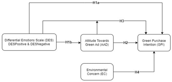 After reviewing the literature, we developed the research model depicted in Figure 1. The model comprises elements for the assessment of various behavioral aspects that impact human behavior and shape fundamental beliefs for green purchase intentions. Attitudes toward the ad (AAD) were measured with a five-item semantic differential scale obtained and adapted from Kim and Cha [74]. The construct included the items of likeness (dislike/like the ad), favorable reaction (unfavorable/unfavorable), reliability (i.e., “I think green advertising is generally reliable.”), and overall attitude (bad/good). To measure the emotional arousal, we implemented the Greek version of the differential emotions scale (DES) [75]. The construct included items to measure positive emotions (joy, interest/curiosity, and inspiration), namely the DESPositive construct, and negative emotions (guilt, disgust, and fear), namely DESNegative, to confirm that the displayed ads evoke the intended emotional reaction in each respective case. Green purchase intention (GPI) was measured with a six-item scale used by Kim and Cha [74]. Example items are as follows: “I am willing to recommend ecofriendly products to others.” and “I can make a substantial contribution to the environment by using ecofriendly products.” Environmental Concern (EC) was measured with a five-item scale adapted from Muralidharan, La Ferle, and Sung [37]. All items were measured in a 5-point Likert scale, and as the instrument was distributed to a Greek audience, questions were translated accordingly to ensure that the meanings of the questions remained intact for statistical validity in our analysis. All items are depicted in Appendix A. Table 1 lists the hypotheses tested.