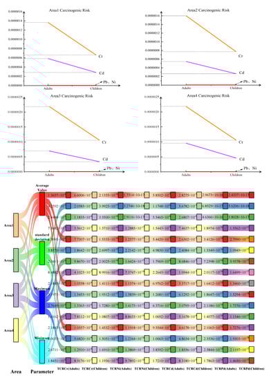 - The non-carcinogenic risk of heavy metals in children at all points in the study area was greater than that in adults. The risk of heavy metal Cr to children and adults was higher than that of other heavy metals. For the probability of carcinogenic risk, the risk pathway in adults was greater than that in children. And the most serious carcinogenic risk in the study area was the harm caused by oral ingestion of heavy metal Cr into the adults’ body.