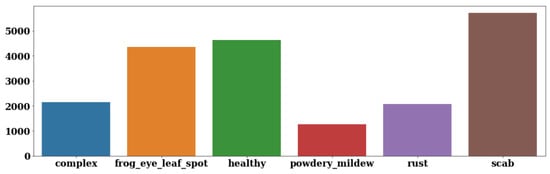 The dataset used for this research work was taken from the Plant Pathology Dataset [20]. In this dataset, high-resolution RGB images of apple foliar diseases, as well as sizable expert-annotated data, are used. It consists of apple foliar diseases with eleven different classes, namely complex, frog_eye_leaf_spot, frog_eye_leaf_spot complex, healthy, powdery_mildew, powdery_mildew complex, rust, rust complex, scab, scab frog_eye_leaf_spot, and scab frog_eye_leaf_spot complex. The description of all the diseases is as follows: