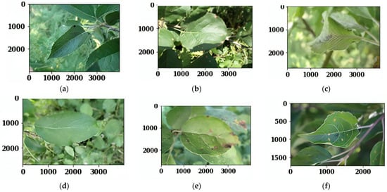 Figure 2 shows the sample images of different apple foliar diseases. Figure 2a shows the healthy apple foliar disease class, and Figure 2b shows the frog_eye_leaf_spot, followed by other different apple foliar disease classes.