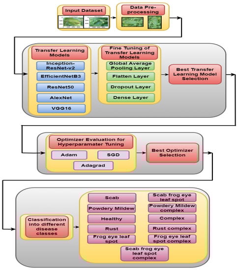 The apple foliar image dataset was fed to different transfer learning models, namely InceptionResNetV2, EfficientNetB3, Resnet50, AlexNet, and VGG16. Feature space obtained from these models was fed to a fine-tuned block. The fine-tuned block was made up of different layers: a pooling, flattening, dropout, and dense layer.