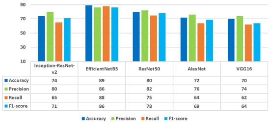 With an F1-score of 86%, EfficientNetB3 outperforms ResNet50, which only manages a 78% value. F1-scores for AlexNet are 69%, while for VGG16, they are 64%. The Inception-ResNet-v2 model has the worst F1-score of all the models.