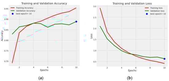 Figure 6 illustrates the training and validation curves for the EfficientNetB3 model. Figure 6a shows the accuracy curve on 10 epochs. It can be seen from the figure that the value of training accuracy on the 2nd epoch is 0.83 and is increasing drastically, and at the 10th epoch, the value of accuracy is 0.95. Figure 6b illustrates the values of training and validation loss on 10 epochs. The value of training loss on the 10th epoch is 0.4. Therefore, with the increase in the value of the epoch, the value of accuracy is increasing and the value of loss is decreasing.