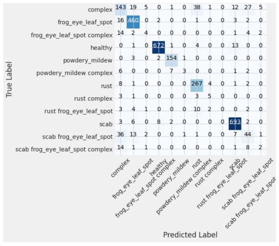 Figure 7 shows the confusion matrix on eleven apple foliar disease classes. It can be seen from the confusion matrix that the model has performed best on the frog_eye_leaf_spot disease class, rust disease class, and scab disease class.