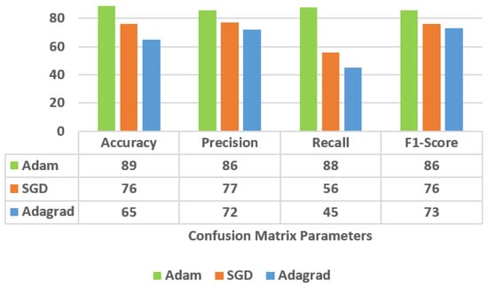 The presented Figure 8 sheds light on how certain optimization strategies fared when applied to an apple foliar image dataset. These metrics are frequently employed for model and method evaluation in machine learning and a statistical analysis. From Figure 8, it is analysed that Adam’s 89% accuracy is the greatest of any model in the dataset, suggesting that it correctly identified 89% of all cases. The accuracy of SGD is 76%, while Adagrad’s is just 65%. Adam looks to perform better than the other two algorithms when compared in this way. SGD has the highest accuracy, with a value of 77%, out of the three algorithms. Adam comes in second with 86% accuracy, just ahead of Adagrad’s 72% value. The algorithms’ ability to reliably recognize positive examples improves as precision increases. So, compared to the other two algorithms, Adam has a higher accuracy rate.